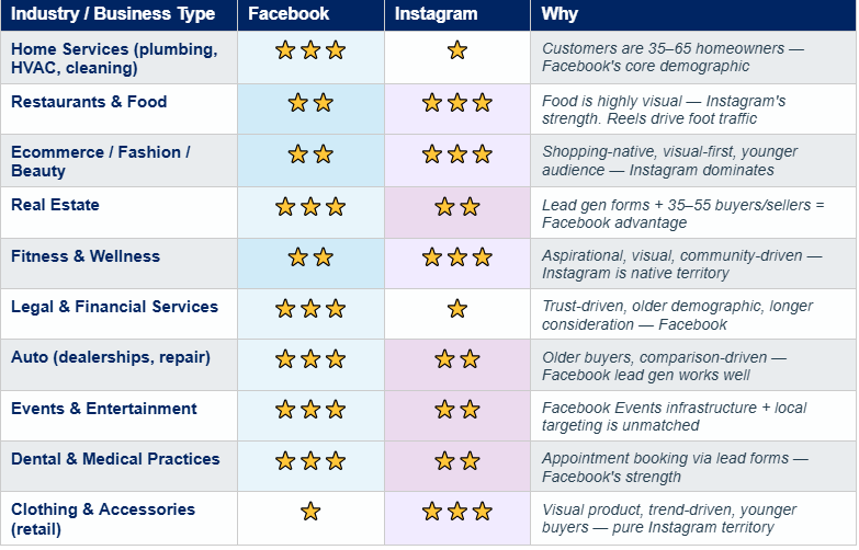 This is the most practical question for most business owners. Based on typical audience demographics, purchase behaviour, and creative format fit, here is how the two platforms compare across common small business industries
