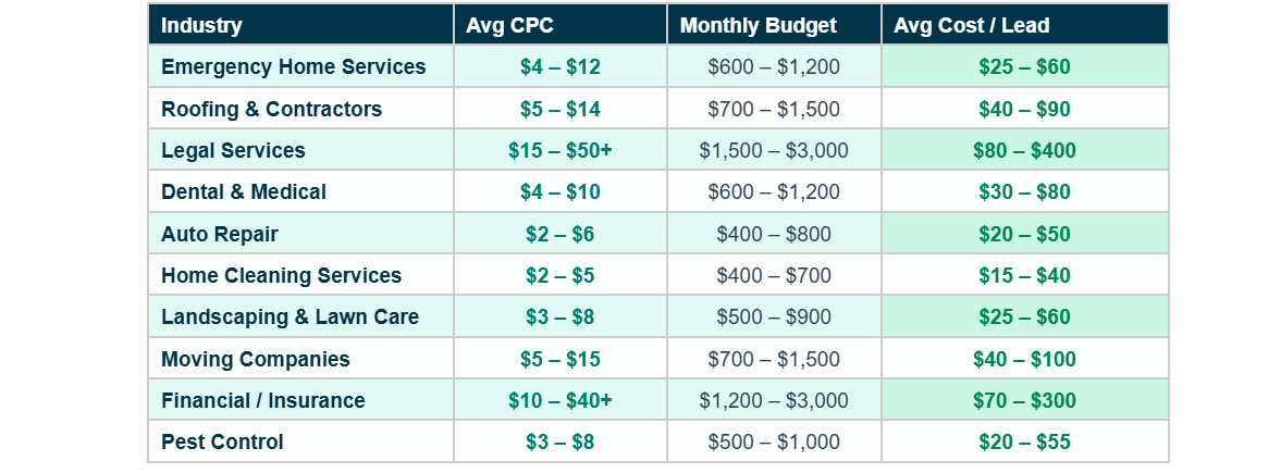 These are realistic average CPCs for small businesses in the US. High-competition cities (New York, LA, Chicago) tend to run 30–50% higher. Smaller markets run 20–30% lower.
