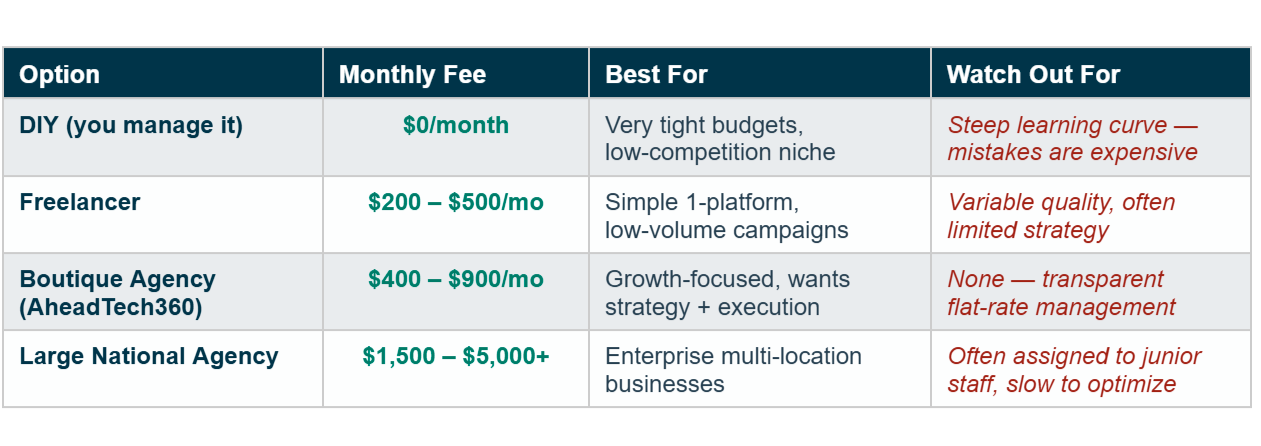 Google Ads is not a set-it-and-forget-it platform. Proper management requires weekly keyword review, bid adjustments, ad copy testing, landing page optimization, and conversion tracking monitoring. Someone has to do this work — either you (costing your time) or a professional (costing a management fee).