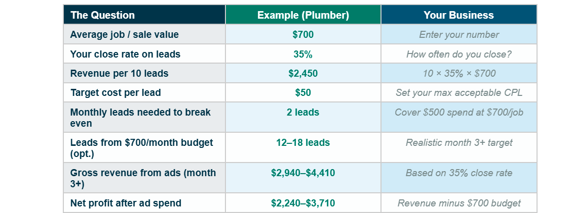 Calculate your Maximum Acceptable Cost Per Lead (MACPL): take your average job value, multiply by your close rate, and that's the revenue per lead. Your MACPL should be no more than 15–20% of that number to maintain a healthy margin. For a plumber with a $700 average job and 35% close rate: revenue per lead = $245. MACPL = $245 × 15% = ~$37. Any campaign generating leads below $37 is profitable. This single number tells you exactly what budget makes sense.