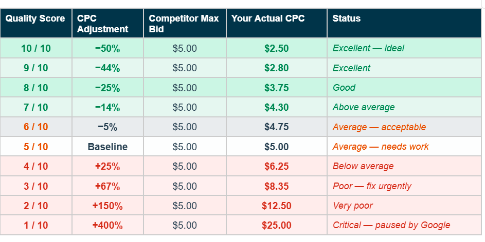 This table shows exactly how Quality Score adjusts your actual CPC relative to a competitor's maximum bid. These adjustments are not estimates — they reflect Google's documented bid adjustment formula.