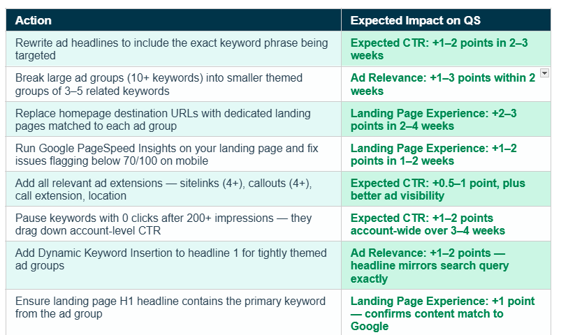 Most Quality Score improvements compound over 2–4 weeks as Google updates its assessments based on new performance data. But the actions that drive those improvements can be taken today: