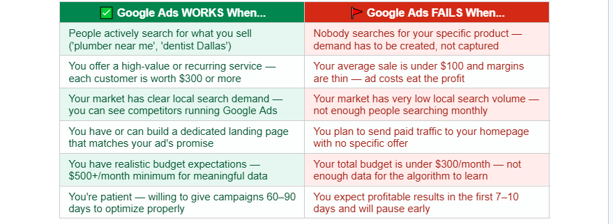If your business matches the left column — especially the first two rows — Google Ads has a very high probability of working for you with the right strategy. If you match multiple items in the right column, the platform may not be the right fit right now.