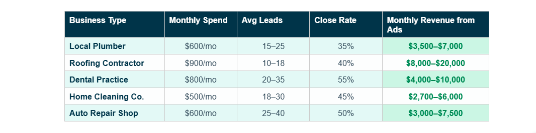 These numbers are from optimized campaigns — typically months 2–4 after launch, not week one. Month one is always the data collection phase. The businesses that achieve these returns committed to the process and didn't quit before the algorithm had time to learn.