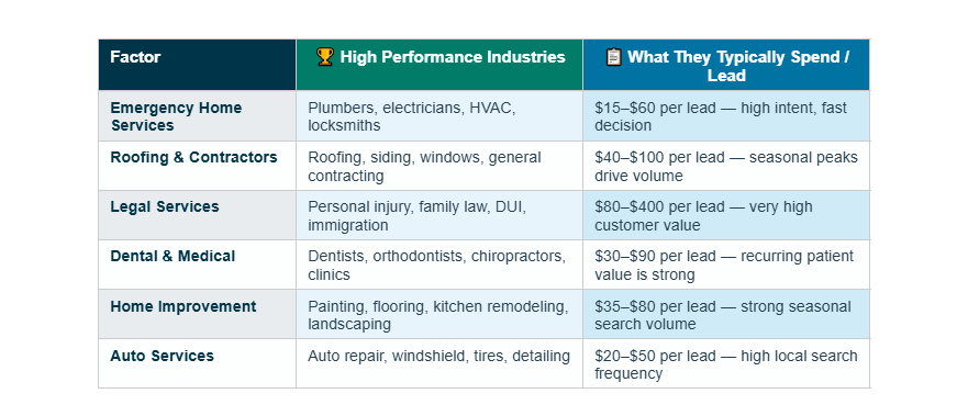 Businesses in these categories have a real structural advantage on Google Ads: people search for them when they have an immediate need. That intent is worth a premium — and for the business owner who shows up at the top, it converts into real revenue.