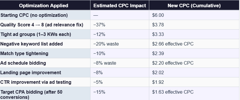 Starting at $6.00 per click and applying all nine strategies progressively: you end up at approximately $1.63 effective cost per click — a 73% reduction without changing your industry, your market, or your budget. The improvement is not theoretical — it reflects what we consistently see when auditing and rebuilding underperforming Google Ads accounts.