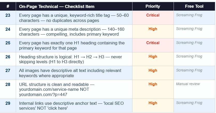 Correct implementation of meta tags, headings, and structured data.