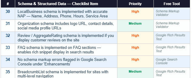 This checklist covers every critical technical SEO issue your small business website should address in 2025. It's written in plain English, organized by category, and includes priority ratings and free tools to check each item yourself.