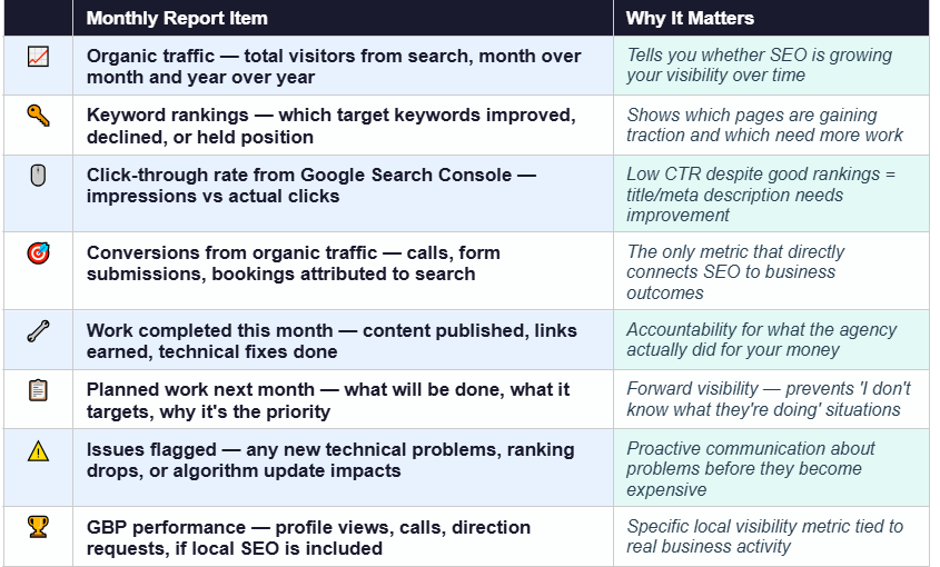 Every month, your SEO agency should deliver a report that tells you what happened, what changed, and what's planned next. Here's what should be in it — and why each item matters: