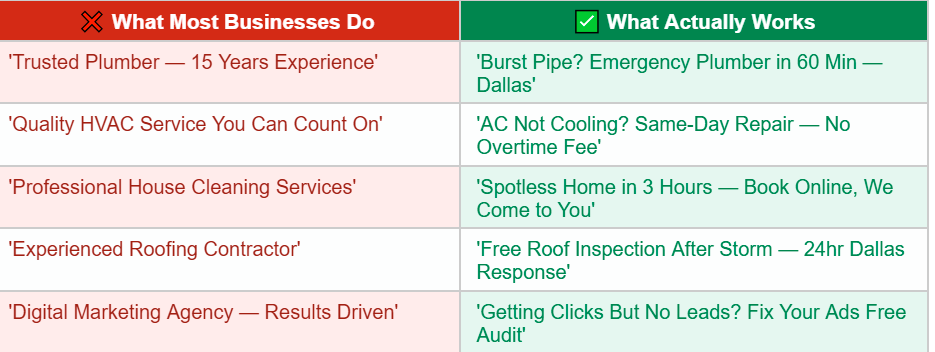 Open most small business ads and you'll see the same pattern: 'We've been serving [city] for 20 years.' 'Family-owned and operated.' 'Licensed, bonded, and insured.' 'Quality service you can trust.' These things are not inherently wrong. But they are not why someone clicks an ad. People click ads because the headline speaks directly to the problem they have right now — not because it tells them how great your business is.